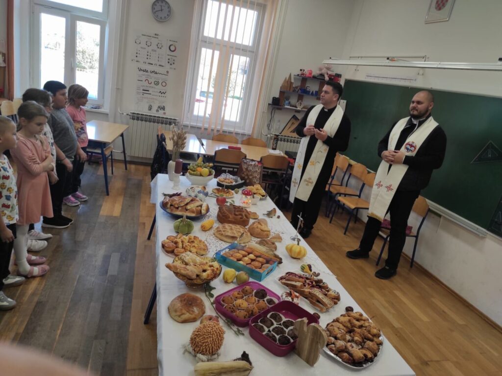 Učenici i učiteljice PŠ Veliko Korenovo i vjeroučiteljica Ivana Amižić u petak, 17.listopada 2025. dočekale su u prostorijama škole župnika Branka Fresla i kapelana Alena Zelčića . Blagoslovili su kruh i učenike naše škole. Uz prigodan program povodom obilježavanja Dana kruha i zahvalnosti za plodove zemlje učenici su se počastili krušnim slatkim i slanim proizvodima koje su zamijesili u školi i kod kuće. Ovih dana u školi učili smo kako kruh dolazi od polja do stola. Učenici su naučili zamijesiti kruh, od kojih sve žitarica možemo načiniti kruh i učili su vesele pjesme posvećene ovim danima zahvalnosti. Time smo priveli ovaj aktivan tjedan kraju, zahvalni i sretni.