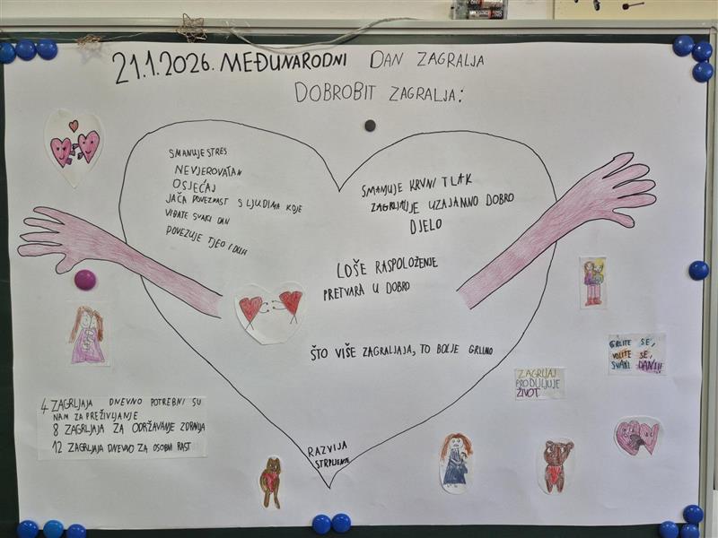 Povodom Međunarodnog dana zagrljaja, učenici PŠ Galovac, poslušali su priču „Medo koji voli grliti“ autora Nicholasa Oldlanda te popričali o njoj. Razgovarali smo o dobrobitima zagrljaja za čovjekovo zdravlje, vrstama zagrljaja te zašto i kako se obilježava Međunarodni dan zagrljaja. Učenici su izradili prigodni plakat i poslušali pjesmu Zagrljaj je lijek.
