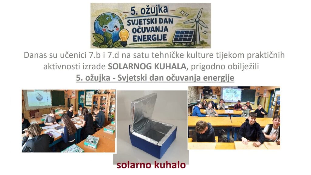 Dana 5. ožujka učenici 7. b i 7.d razreda na satu su tehničke kulture prigodno obilježili Svjetski dan očuvanja energije izradom praktičnog rada SOLARNOG KUHALA i na taj način  potaknuti ih za shvaćanje problema neučinkovitoga korištenja energijom, pronalaženju mogućih rješenja učinkovite uporabe energije u svim sektorima krajnje potrošnje te odgovornog ponašanja jer je energetski savjesno ponašanje bitan alat u borbi protiv klimatskih promjena i  poticanju razvoja održivih društava.
